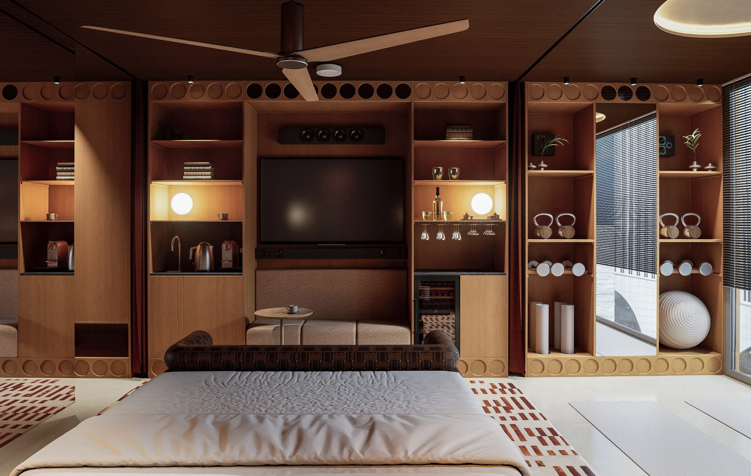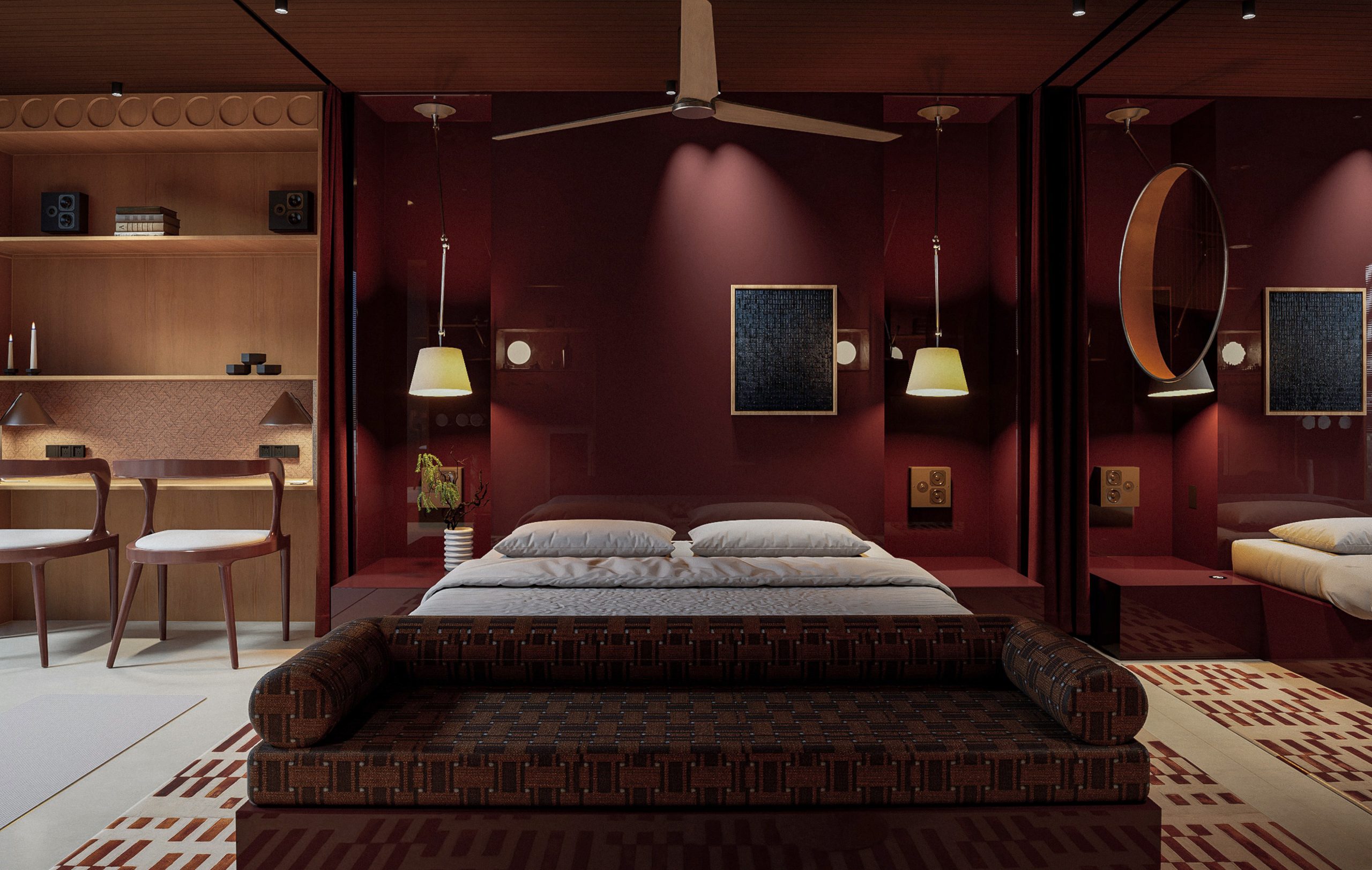 Los diferentes espacios de la habitación pueden integrarse o independizarse para crear diferentes armósferas mediante un sistema de cortinas automatizadas a la vez que manuales.