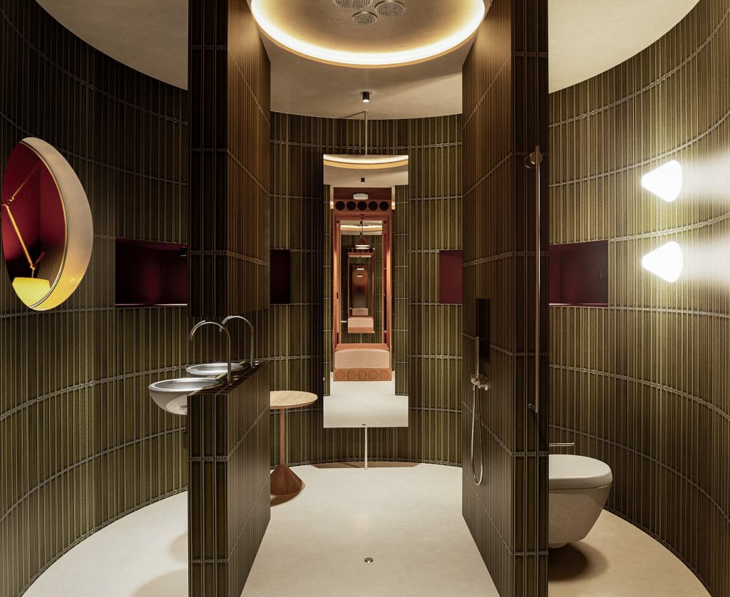 El baño se plantea como un espacio envolvente y circular que conecta con la zona del domitorio mediante una ventana redonda con vidrio ámbar.