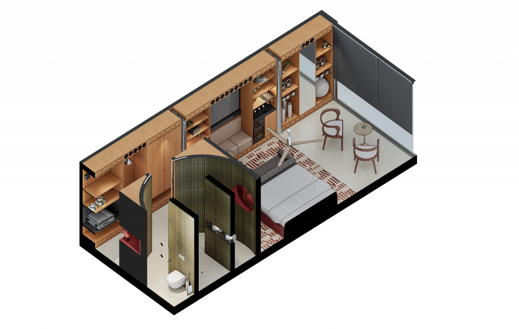 Con el objetivo de crear un espacio flexible y adaptable al viajero contemporáneo, se retoma la visión utópica de las viviendas del futuro desarrollada entre 1920 y 1970.